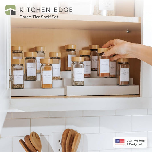 KitchenEdge Expandable Spice Rack Organizer for Cabinet, 3-Tier Shelf for Spice Organization (11” to 22”), Fits 36 Spice Jars, Seasoning and Pantry Storage, Non-Slip Feet, 100% Acacia Wood