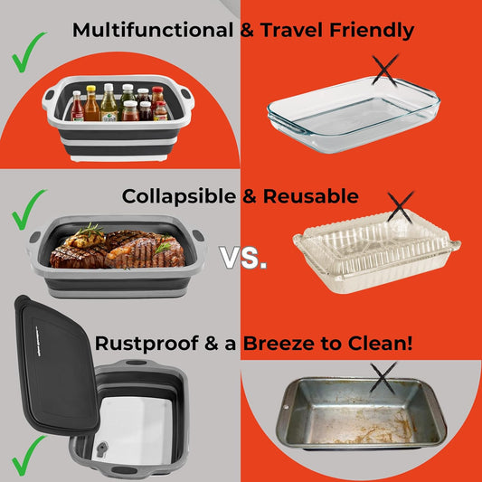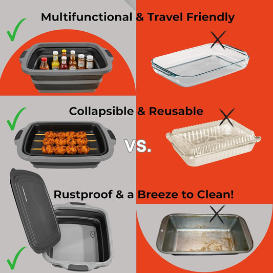 Collapsible Large (8L) BBQ Marinating Tub w/Cutting Board | Multipurpose Food-Grade TPE Prep Tub w/Lid | Built-in Colander & Drain Plug - for Camping | Tailgate | Picnic - Slate Black
