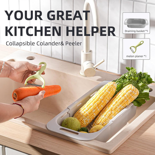 Extended Long Over the Sink Colander, Wash Vegetables Fruits Collapsible Colander Strainer, 14.5"-19.3" Extendable Kitchen Sink Accessories for Dishes Drying, Vegetable Basket, with Peeler