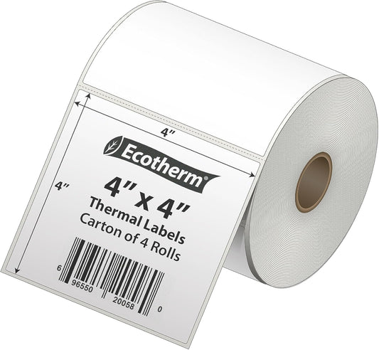 4" x 4" Thermal Labels | 4 Rolls | 1508 Labels | fits Zebra, Munbyn, Rollo, Godex, Arkscan, iDPRT, Offnova Thermal Label Printers and More | Blank White Adhesive Stickers by Ecotherm