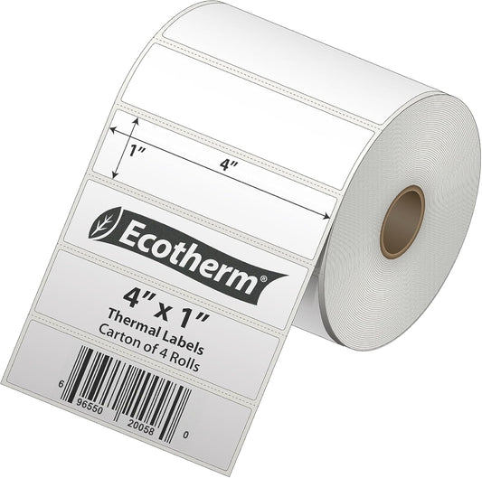 4" x 1" Thermal Labels | 4 Rolls | 5360 Labels | fits Zebra, Munbyn, Rollo, Godex, Arkscan, iDPRT, Offnova Thermal Label Printers and More | Blank White Adhesive Stickers by Ecotherm