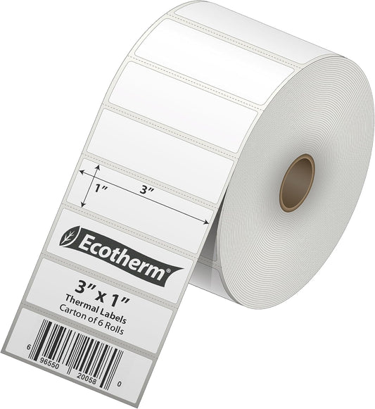 3" x 1" Thermal Labels | 6 Rolls | 15000 Labels | fits Zebra, Munbyn, Rollo, Godex, Arkscan, iDPRT, Offnova Thermal Label Printers and More | Blank White Adhesive Stickers by Ecotherm