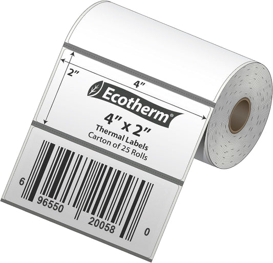 4" x 2" Thermal Labels | 6 Rolls | 7500 Labels | fits Zebra, Munbyn, Rollo, Godex, Arkscan, iDPRT, Offnova Thermal Label Printers and More | Blank White Adhesive Stickers by Ecotherm