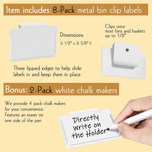 Basket Labels Clip on | Label Holders for Basket or Storage Bins Includes White Chalk Markers (8 White Holders + 2 Black Chalk Makers)