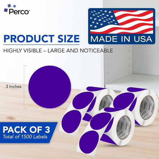 Perco Purple 3-Inch Round Circle Dot Sticker Labels - Multi-Roll Pack (3 Rolls, 500 Labels Each) - Permanent Adhesive, Vibrant Colors, Strong Hold - Perforated for Easy Use - Made in USA