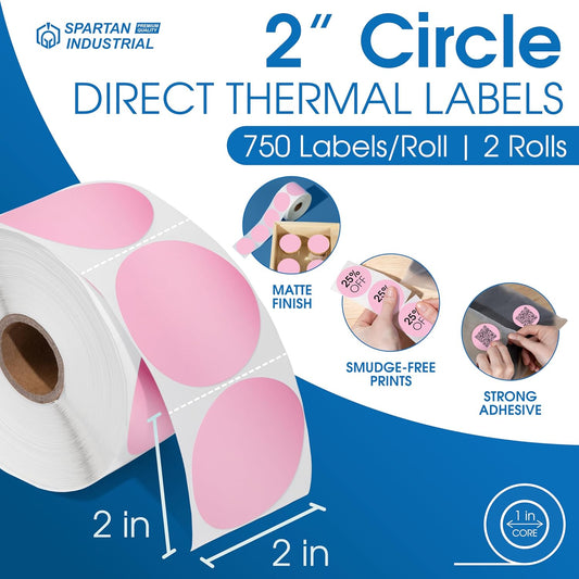 Spartan Industrial 2" Direct Thermal Pink Labels | Perforated Custom Circle Logo Stickers - Works with Rollo, Zebra, MUNBYN Desktop Printers - 2 Rolls, 750/Roll