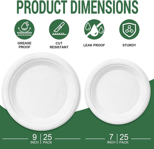 50 Compostable Paper Plates, Includes 25-9" & 25-7" Heavy Duty Disposable Plates, Biodegradable Sugarcane Bagasse, White