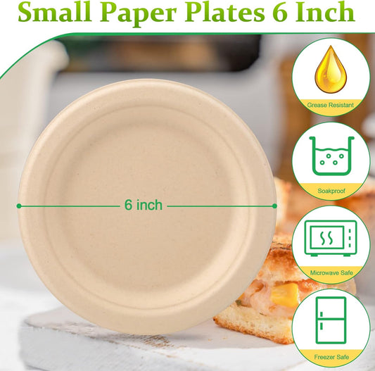 6 Inch Compostable Plates 100 Pack Heavy Duty Compostable Paper Plate, Disposable Eco-Friendly Sugarcane Bagasse Plate, Natural Brown Plates for Dinner, Dessert, and Weddings