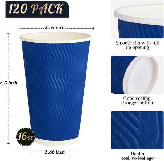 JollyPack 120 Pack 16 oz Paper Coffee Cups, Blue Disposable Beverage Cups with Insulated Ripple Wall for Coffee, Tea, and Hot Chocolate