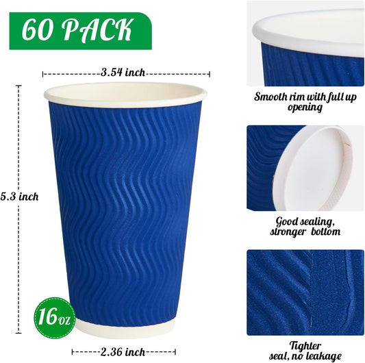 JollyPack Paper Coffee Cups, 16 oz, Blue, 60 Pack, Heat Resistant, Disposable, Ripple Wall, for Coffee, Tea, Hot Chocolate