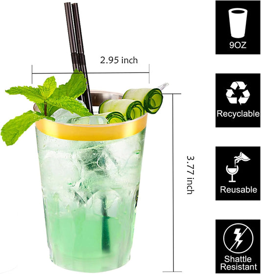 I00000 Heavy Duty Plastic Cups, 9 oz, Gold Rimmed, Clear, 100 Count, BPA Free, Disposable, for Party & Wedding