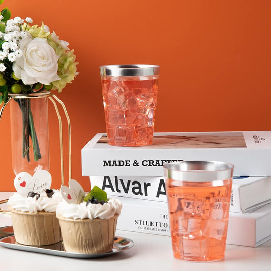 I00000 100PCs Silver Plastic Cups, 10 oz Clear with Silver Trim, Heavy-Duty Disposable Hard Plastic Cups for Party & Wedding