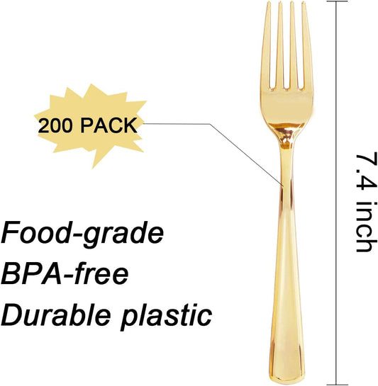 Liacere 200pcs Gold Plastic Forks - Heavyweight - 7.4 Inch Heavy Duty Plastic Forks - Gold Plastic Silverware Perfect For Parties & Weddings & Restaurants & New Year And Daily Using