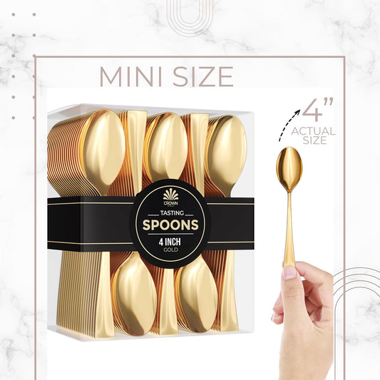 EXQUISITE Mini Spoons For Desserts - Bulk Pack Of 100 Gold Dessert – Disposable 4.5 Inch Plastic Appetizer Real Flatware Look Miniature Gold Bpa Free Food SafeSafe