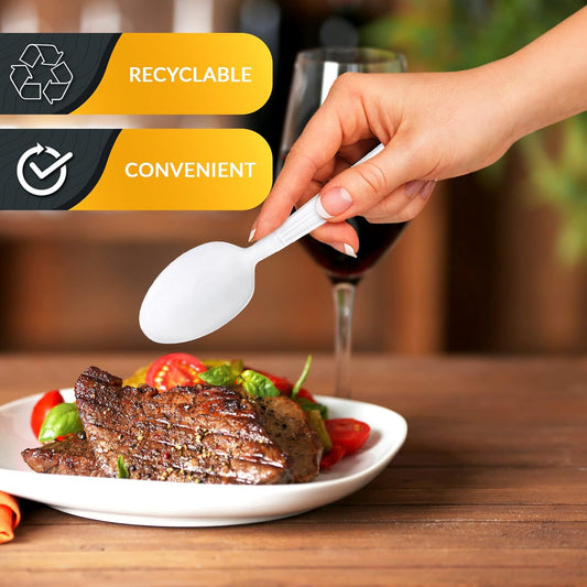 Prestee 100 Clear Plastic Spoons Bulk - Durable Disposable Plastic Silverware Spoons - Heat-Resistant Spoon Cutlery - Heavy Duty Flatware Pack - Disposable Silverware Utensil Set for Hot and Cold Food
