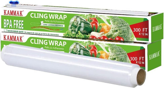 KAMMAK Plastic Wrap, Food Wrap with Slide Cutter, Cling Wrap 12 inch Food Service Clear Cling Film 2 Pack 300 Square FT Roll BPA-Free Microwave-Safe Kitchen Wrap Quick Cut Plastic Film