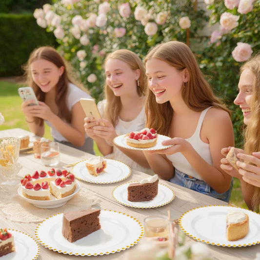 supernal 100pcs White Plastic Plates with Gold Trim Fancy Disposable Plates Includes 50 Plastic Dinner Plate and 50 Dessert Disposable Plate for Party,Wedding,Bridal Shower