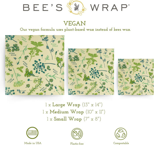 Bee's Wrap Vegan Beeswax Wraps for Food - Vegan Herb Garden 3 Pack (S, M, L) Made in USA Reusable & Organic Food Wraps, Sandwich Wrap & Bowl Covers - Eco Alternative to Aluminum Foil & Plastic Wrap