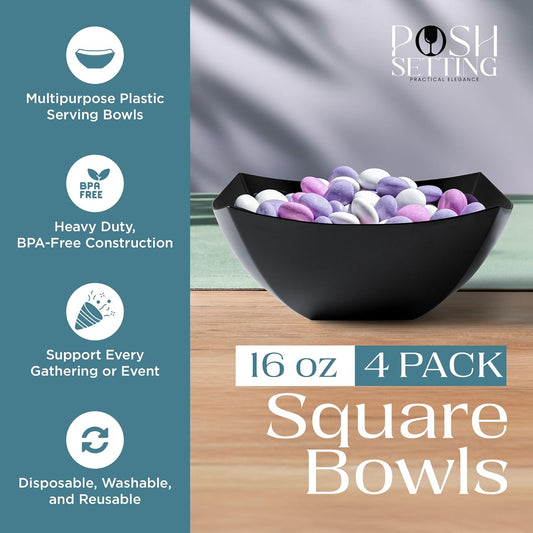 Posh Setting - Black Plastic Serving Bowls for Party (8oz - 4 Pack) Square Bowls, Disposable Chip Bowls, Candy Bowls for Party Table, Salad & Fruit Bowls for Party, Candy Containers for Candy Buffet