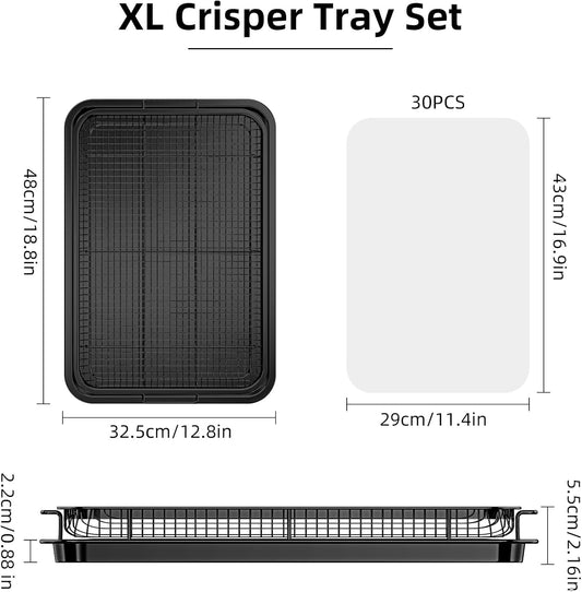 Air Fryer Basket for Oven, OPENICE 15.6" x 11.6" Air Fryer Tray and Pan Set with 30PCS Parchment Papers, Stainless Steel Oven Air Fryer Basket and Tray for Baking Grilling - Black