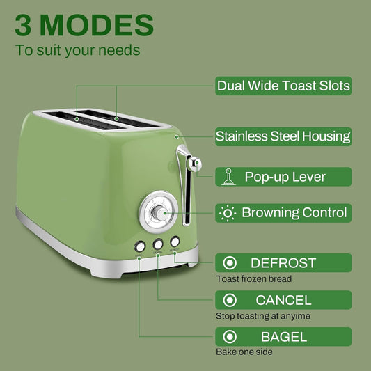 SUSTEAS Toaster 4 Slice Wide Slot, Stainless Steel Bread Bagel Toasters, Retro Long Slot Tostadora for Defrost, Reheat, Removable Crumb Tray, 1500W, 6 Browning Settings, Retro Green