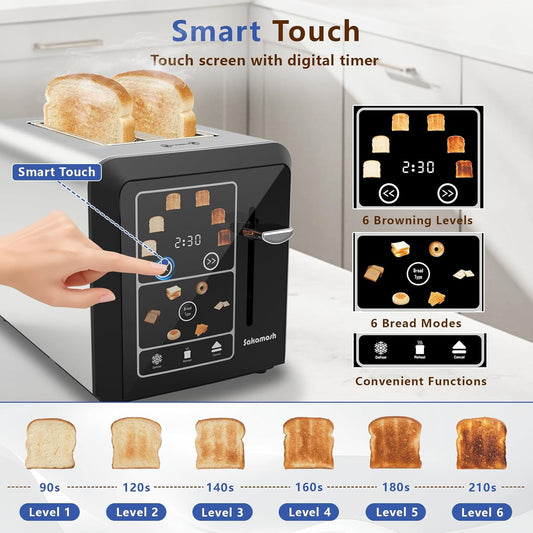 Touch screen Toaster 2 slice, Smart Digital Toasters, 6 Browning Levels & 6 Bread Types, Bagel Memory Function, Timer, Stainless Steel, 800W
