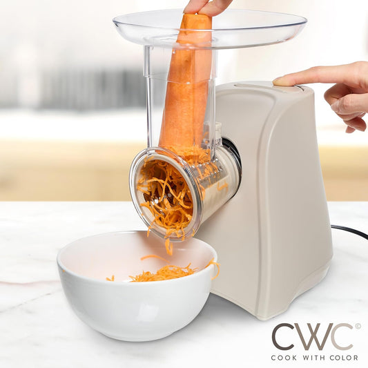 COOK WITH COLOR 5-in-1 Electric Slicer, 150W Food Prep Machine – Cheese Shredder, Fine & Coarse Graters, Potato Grater, Vegetable Slicer, Fruit, Salad Shooter, Compact Design for Bowl Prep, Sand