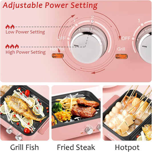 Topwit Hot Pot Electric with Grill, 2 in 1 Indoor Non-stick for Steaks, Shabu Shabu, Noodles, Simmer and Fry, Korean BBQ Grill, Independent Dual Temperature Control, Pink