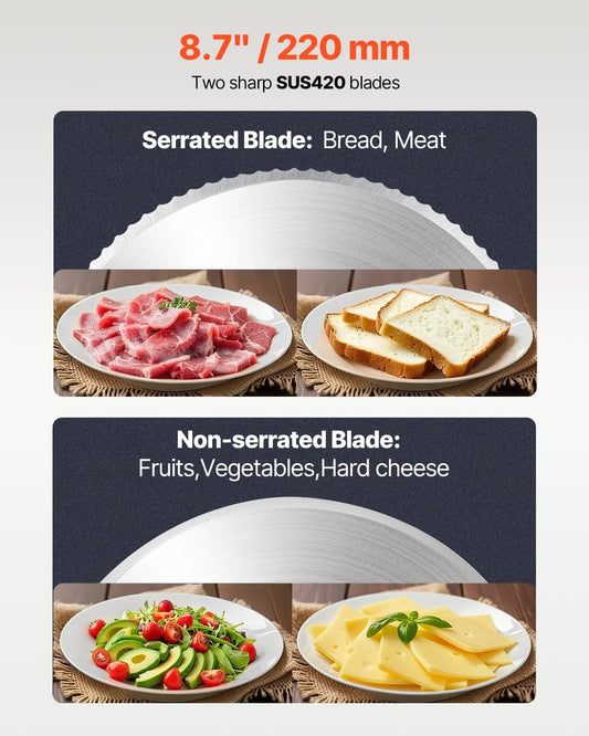 VEVOR Meat Slicer, 8.7 inch Electric Deli Food Slicer with Two Premium SUS420 Blades, 0-0.6 inch Adjustable Thickness, 180W Food Slicer Machine for Meat, Hard Bread and Cheese, Home Use