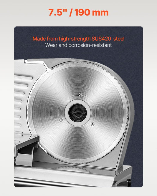 VEVOR Meat Slicer, 180W Electric Deli Food Slicer, 7.5 inch Meat Cutter with a Premium SUS420 Blade, 0-0.6 inch Adjustable Thickness, Food Slicer for Frozen, Hard Bread and Cheese, Home Use