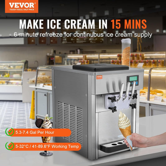 VEVOR Commercial Ice Cream Machine, 21 QT/H Yield, 1800W 3-Flavor Countertop Soft Serve Ice Cream Maker, 2 x 4L Hopper 2 x 1.8L Cylinder, LCD Panel Auto Clean Pre-cooling, for Restaurant Snack Bar