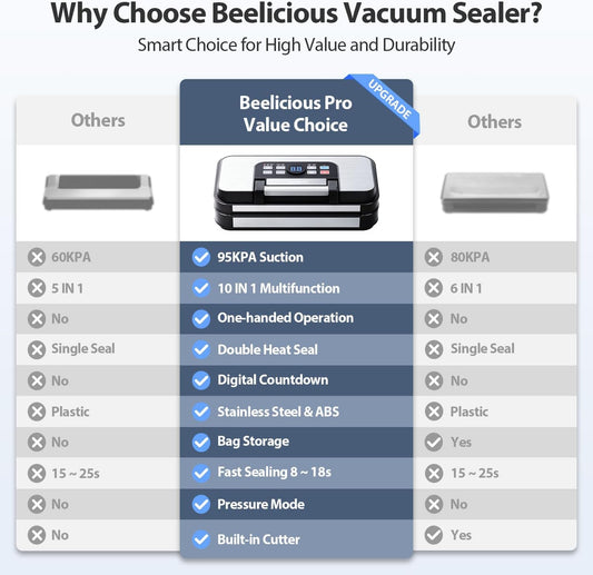 Automatic Food Vacuum Sealer Machine | Beelicious Pro 80KPa 8-In-1 Food Vacuum Saver with Starter Kits | 15 Bags, Pulse Function, Moist&Dry Mode and External VAC for Containers, Stainless Steel