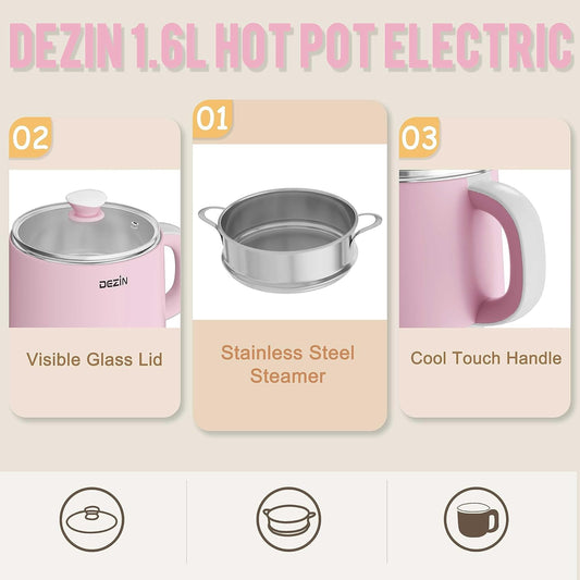 Dezin Hot Pot Electric with Steamer, Rapid Noodles Cooker, Stainless Steel Electric Pot 1.6 Liter, Perfect for Ramen, Egg, Dumpling, Soup, Oatmeal with Temperature Control and Keep Warm Function