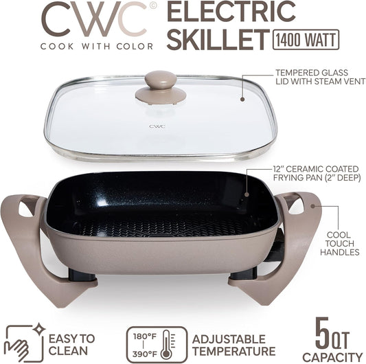 COOK WITH COLOR Electric Skillet - 12" x 12" Ceramic Nonstick Pan, PFAS-Free, 1400W, Tempered Glass Lid, Variable Temperature, Removable Heating Probe, Cool-Touch Handles, Greige