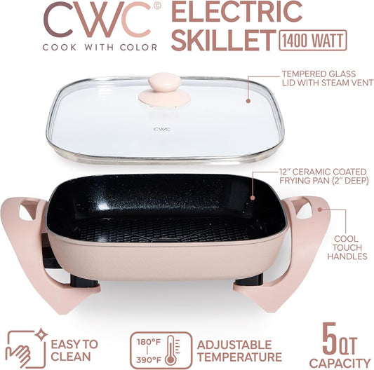 COOK WITH COLOR Electric Skillet - 12" x 12" Ceramic Nonstick Pan, PFAS-Free, 1400W, Tempered Glass Lid, Variable Temperature, Removable Heating Probe, Cool-Touch Handles, Blush