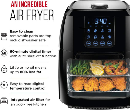 Chefman Compact 6.3-Qt 4-In-1 Digital Air Fryer+, Rotisserie, Dehydrator, Convection Oven, XL Family Size, 8 Touch Screen Presets, BPA-Free, Auto Shutoff, Accessories Included, Black