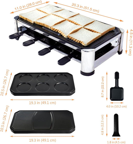 TAMARIT 8-Person Raclette Grill, Electric Party Grill with Nonstick grill & crepe Plates, 8 Pans & Spatulas, 1500W (Indoor), Stainless Steel