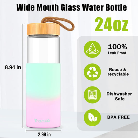 Tronco 24oz Glass Water Bottles with Bamboo Lid & Silicone Sleeve, Leak Proof, BPA Free, Reusable Borosilicate Glass Bottles for Juicing, Smoothies, Juice & Water, for Men & Women Gym, Office, Travel