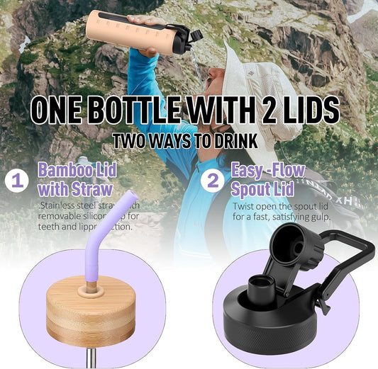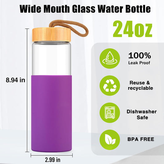 Glass Water Bottle with Straw, 24oz Glass Drinking Bottle with 2 Lids-Bamboo and Spout Lid with Phone Holder Handle for Gym Sports,with Silicone Sleeve and Time Marker,Purple
