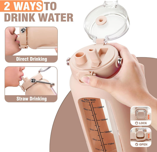kytffu 64 oz Glass Water Bottle with Straw and Stainless Steel Handle, Half Gallon Water Bottle with Silicone Sleeve and Time Marker, 2L Large Glass Bottle for Gym, School, Travel, Leak-proof (Amber)