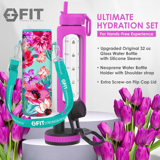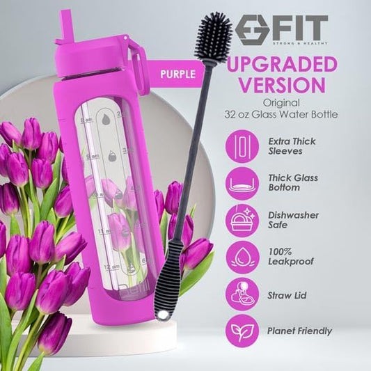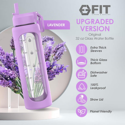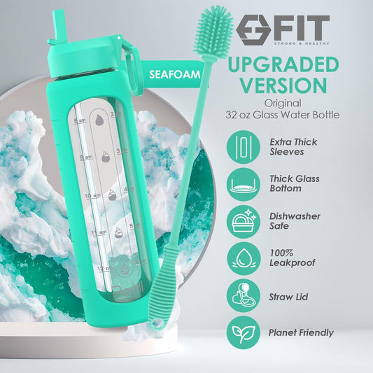 FIT Strong & Healthy 32 oz Glass Water Bottle with Straw Lid, Time Marker, Sleeve & Extra Lid - Motivational, Wide Mouth 1 Liter Glass Drinking Bottle