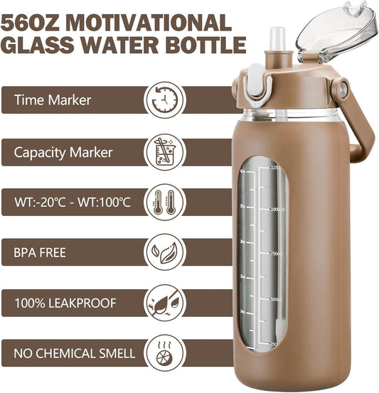 kytffu 56oz Glass Water Bottles with Straw, Motivational Glass Bottle with Silicone Sleeve and Time Marker, Leakproof Large Glass Water Jug for Gym Home Office,Amber