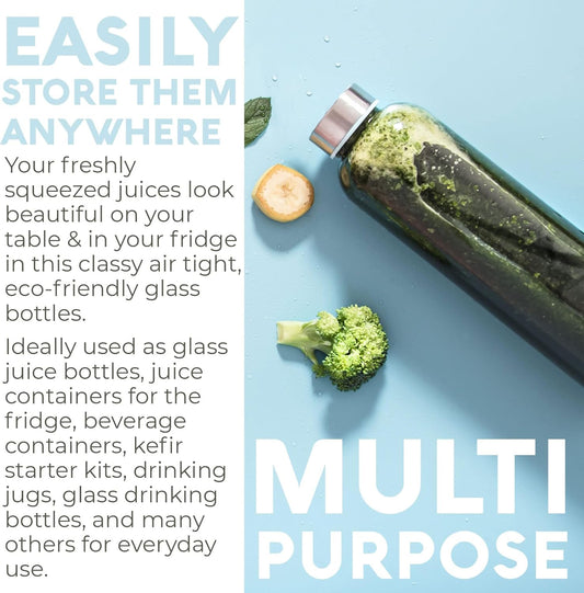 Epica Clear Glass Bottles with Lids, 18oz Resuable Glass Water Bottles for Juicing with Stainless Steel Cap to store Milk, Smoothie, etc., 100% Leak Proof, Durable and Dishwasher Safe (Set of 6)