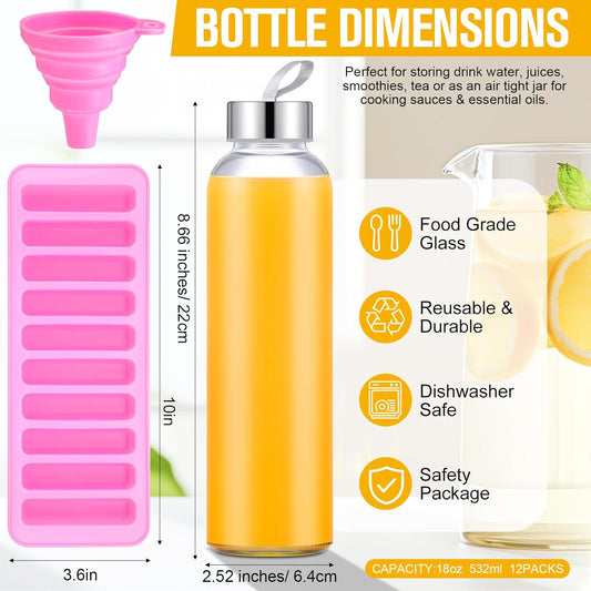 Honeydak 12 Pcs 18 oz Glass Water Bottles Glass Juice Bottles with Protection Sleeves, Stainless Steel and Bamboo Lids Reusable Glasses Funnel, Ice Mold, Brush for Milk Smoothie Beverage Tea