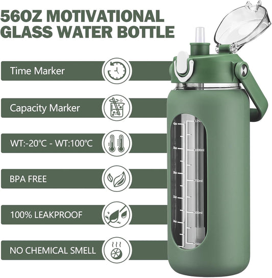 kytffu 56oz Glass Water Bottles with Straw, Motivational Glass Bottle with Silicone Sleeve and Time Marker, Leakproof Large Glass Water Jug for Gym Home Office,Ink green