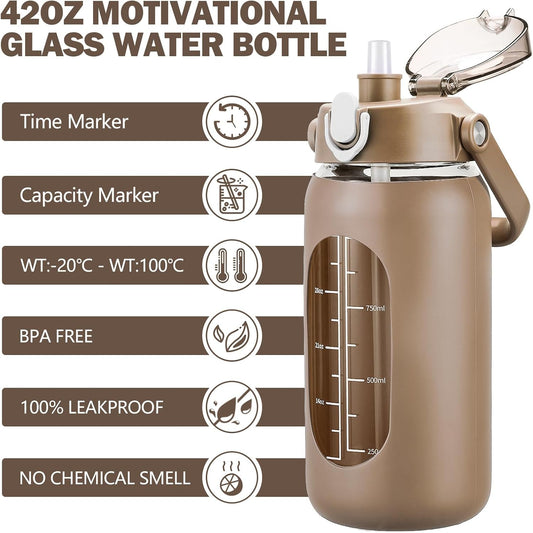 kytffu 42oz Glass Water Bottles with Straw, Motivational Glass Bottle with Silicone Sleeve and Time Marker, Leakproof Large Glass Water Jug for Gym Home Office,Amber