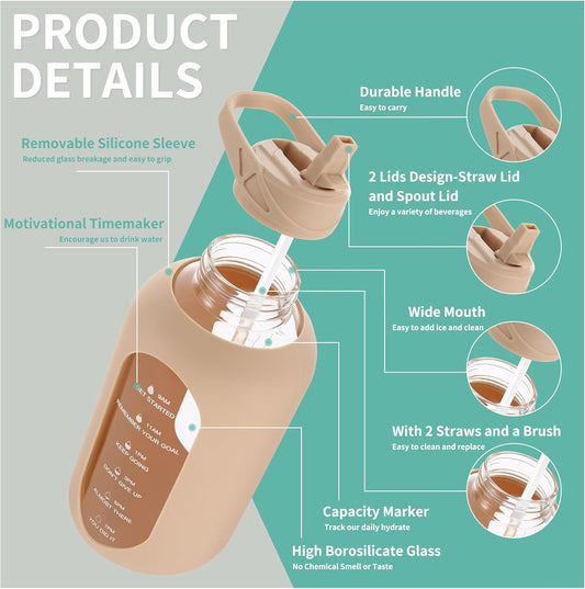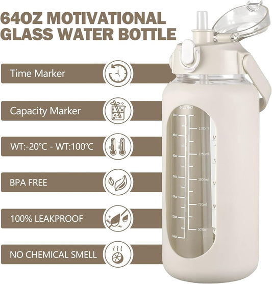 kytffu 64oz Glass Water Bottles with Straw, Half Gallon Motivational Glass Bottle with Silicone Sleeve and Time Marker, 2L Leakproof Large Glass Water Jug for Gym Home Office,White