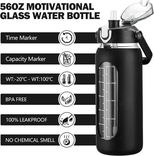 kytffu 56oz Glass Water Bottles with Straw, Motivational Glass Bottle with Silicone Sleeve and Time Marker, Leakproof Large Glass Water Jug for Gym Home Office, Black.