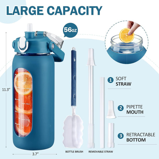 kytffu 56oz Glass Water Bottles with Straw, Motivational Glass Bottle with Silicone Sleeve and Time Marker, Leakproof Large Glass Water Jug for Gym Home Office,Blue