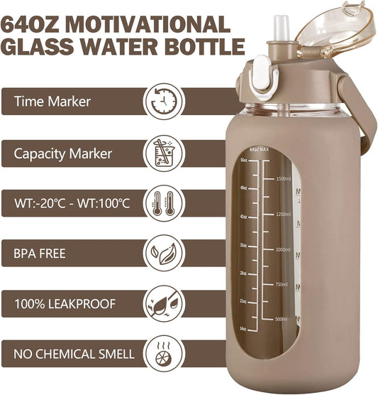 kytffu 64oz Glass Water Bottles with Straw, Half Gallon Motivational Glass Bottle with Silicone Sleeve and Time Marker, 2L Leakproof Large Glass Water Jug for Gym Home Office,Amber